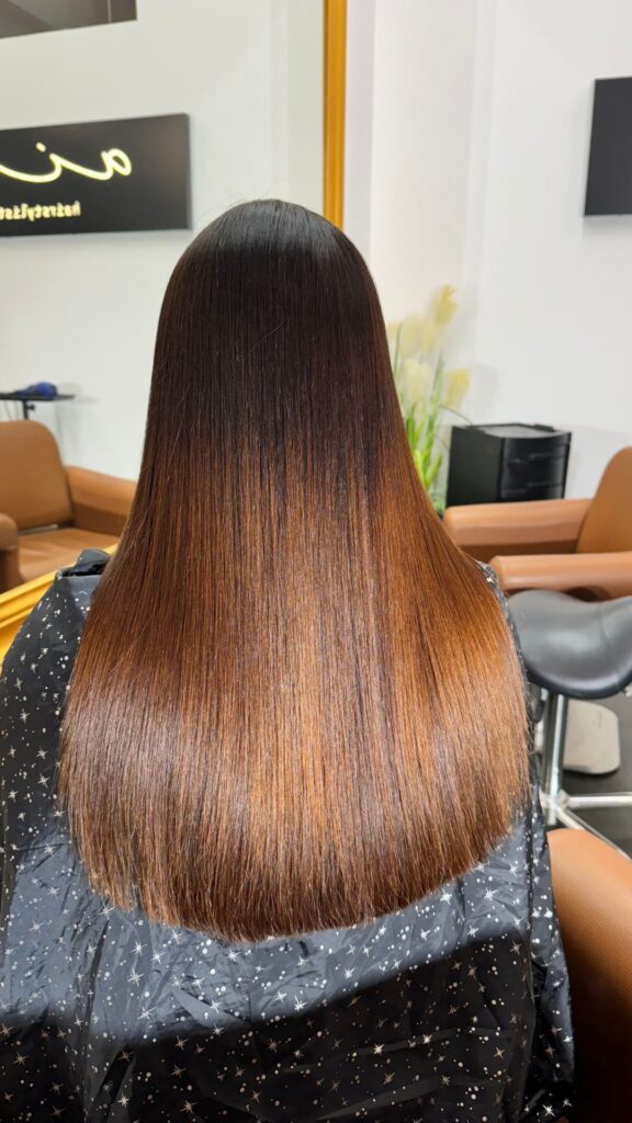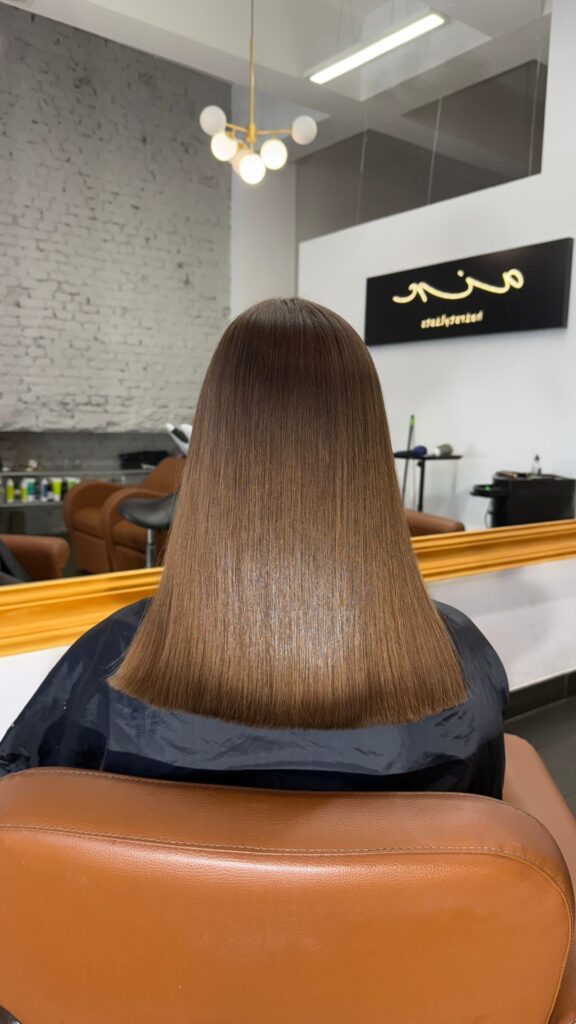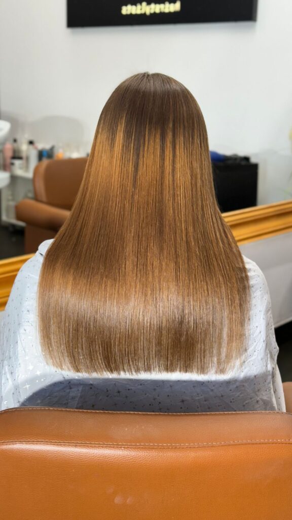 - Keratynowe prostowanie włosów – wygładza, uzupełnia ubytki keratyny i wzmacnia pasma, dzięki czemu stają się proste, gładkie i odporne na puszenie.